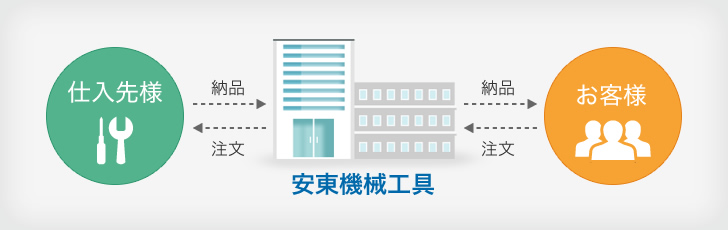 私たちはメーカーとは異なり、多種多様な商品を仕入れて製造業者様へ販売する産業機械専門商社です。今や世界を視野に置いた生産活動が求められるモノづくり社会の中で、お客様へ優れた商品(ハード)を提供するだけでなく、お客様の頼れるパートナーとして、産業機械の企画提案から販売、施工、アフターフォローまでを一括受注し、これまでの長い歴史の中で培ってきたネットワークを活かした最適な情報(ソフト)と共にオーダーメイドの発想で究極のサービスを日々追及しています。それが、インターネット通販が主流な現代で、安東機械工具が必要とされ続けている理由です。